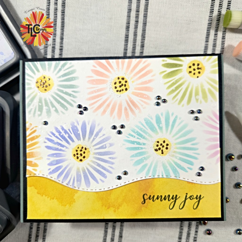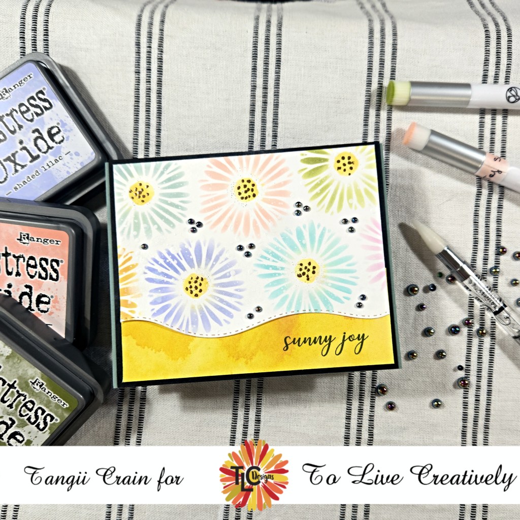 For today’s card I am playing with the NEW Gerbera Springtime Stencil, by TLC Designs. To start off I stencil the Gerber daisy’s with some Oxide inks. For the middle of each flower I used a Embossing Ink pen and some Copper Blush EP to heat emboss… I love the added texture!
