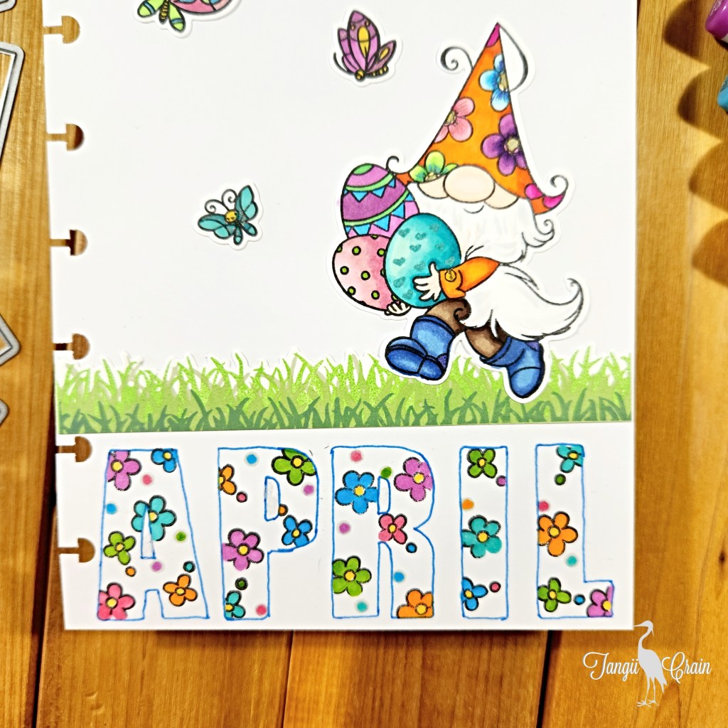 I am finally sharing my April bullet journal cover page. I’ve been using the Gnomes from Trinity Stamps for my monthly cover pages, they’re so stinking CUTE! For April I used the Spring in my Step stamp set & coord. dies