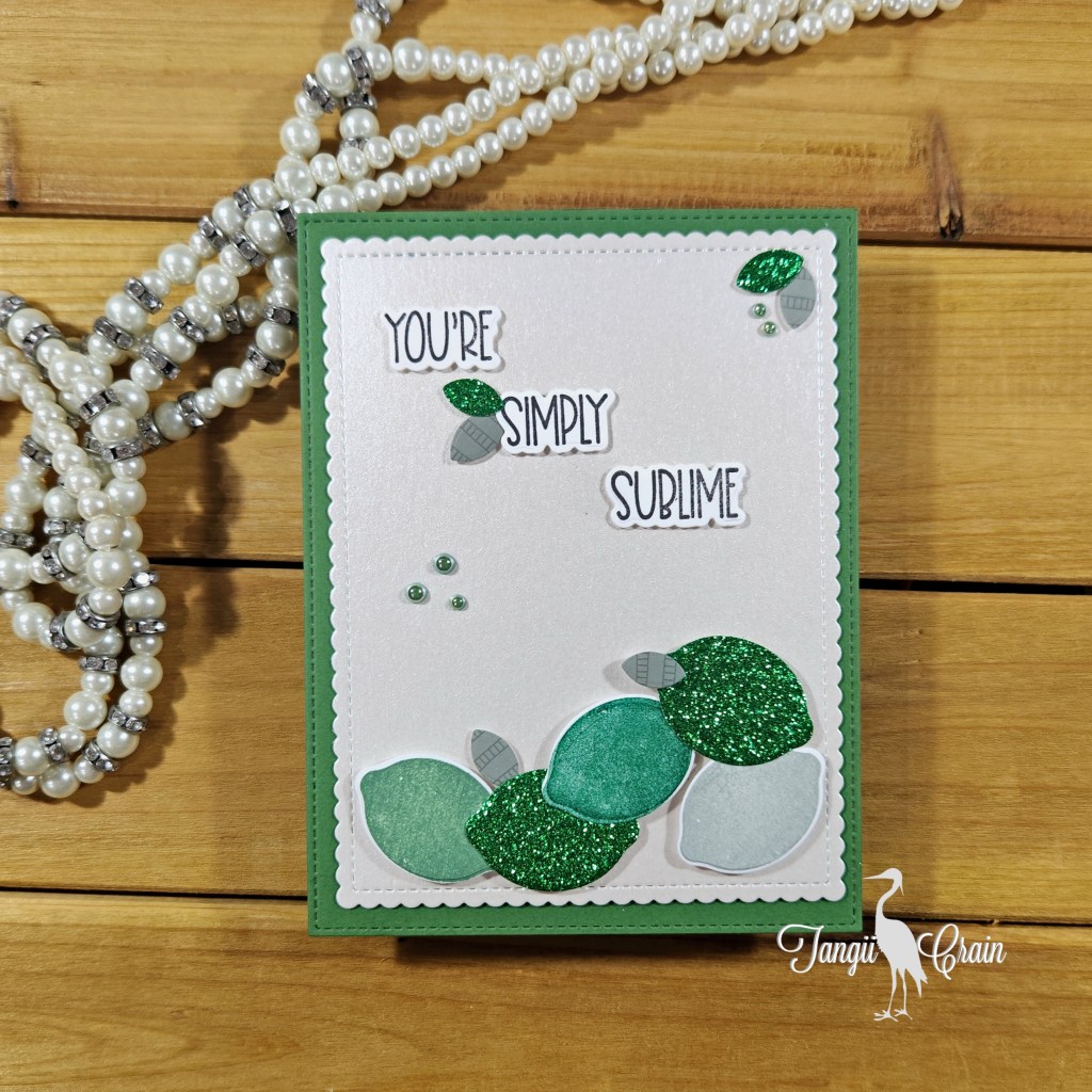 My scalloped card base is white Pearl cs (so shimmery and so pretty!). I used the Zest Wishes set (from Trinity Stamps) for the rest of my card. This is a stamp & coord die combo set. I used just the dies with some Emerald Glitter cs to cut out a couple of limes & some leaves. Next I grabbed a few green ink pads and stamped a few more limes, also die cutting them. Once I placed everything I decided I needed a few more leaves so I die cut a few more from some scraps of patterned paper.