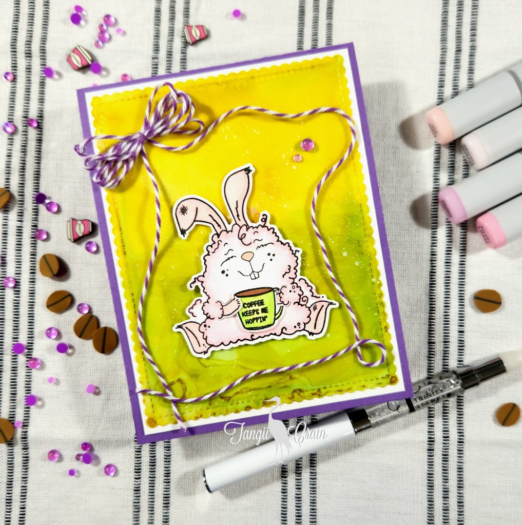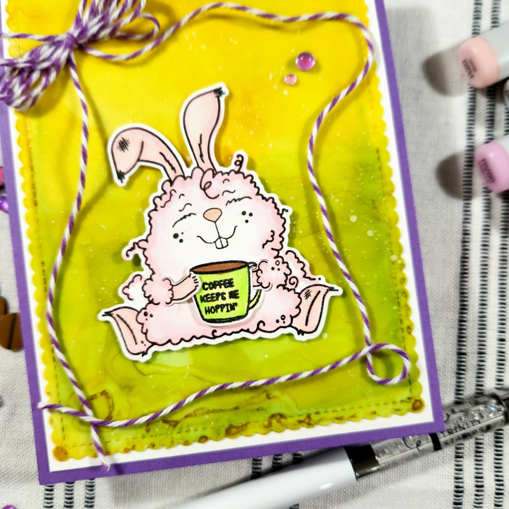 This Trinity Stamps set is retired, but I am so in LOVE with this fluffy guy I just needed to ink him up! My background piece is actually a piece of Yupo, I spent some time playing with some alcohol inks. This piece is has some yellow’s & greens with a bit of white speckles.